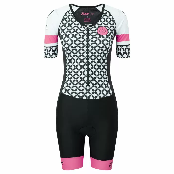 Built to provide maximum comfort on race day, the Zoot Women’s Bolt Short Sleeve Trisuit is crafted from sublimated Italian fabric that provides breathability and moisture management to keep you dry and your temperature regulated. An Integra SBR 2D pad provides support where you need it most and a dropped back construction provides coverage and optimal mobility so you can move without restriction. A long front zipper with semi-lock puller can be adjusted for added ventilation while elastic cuffs and waistband give a secure fit. Leg cuffs with a skin-friendly zipper prevent the shorts from riding up and a two-part open back pocket provides easy access storage. Finished with a UPF 50+ treatment to provide protection in sunny conditions.